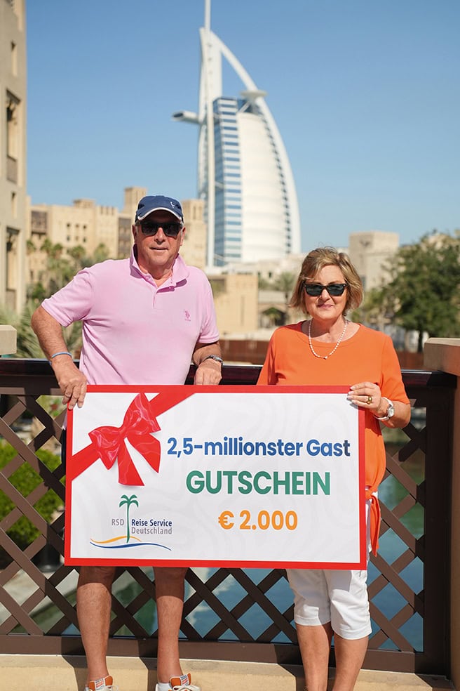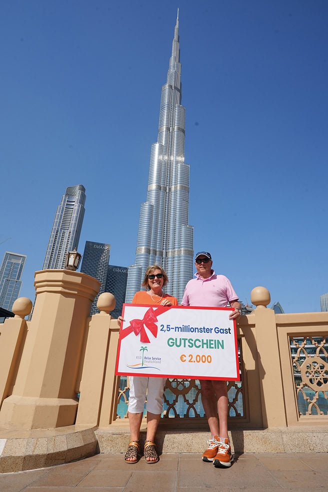 I Dubai besökte våra två jubilarer inte bara det enorma Dubai Mall eller det hisnande hotellet Atlantis med sitt gigantiska akvarium. Från den himmelshöga Burj Khalifa tittade de ner från 555 meters höjd på vackert upplysta fontänspel. På 27:e våningen i det världsexklusiva segelformade lyxhotellet Burj Al Arab sippade de andäktigt på sina cocktails. „Det var helt galet“, säger de när de tänker tillbaka på det. Under en kvällsbåttur förundrades de över yachterna och den futuristiska arkitekturen hos skyskraporna i stadsdelen Dubai Marina. De var särskilt fascinerade av de enorma dimensionerna av Sheikh Zayed-moskén i Abu Dhabi, en av världens största. I dess hallar och innergård finns plats för 40 000 troende. Sist men inte minst: På sin lediga dag solade de sig på den härliga stranden vid sitt 5-stjärniga lyxhotell på Palmön. „När har man annars chansen att göra det i november?“, ser de tillbaka med viss saknad.