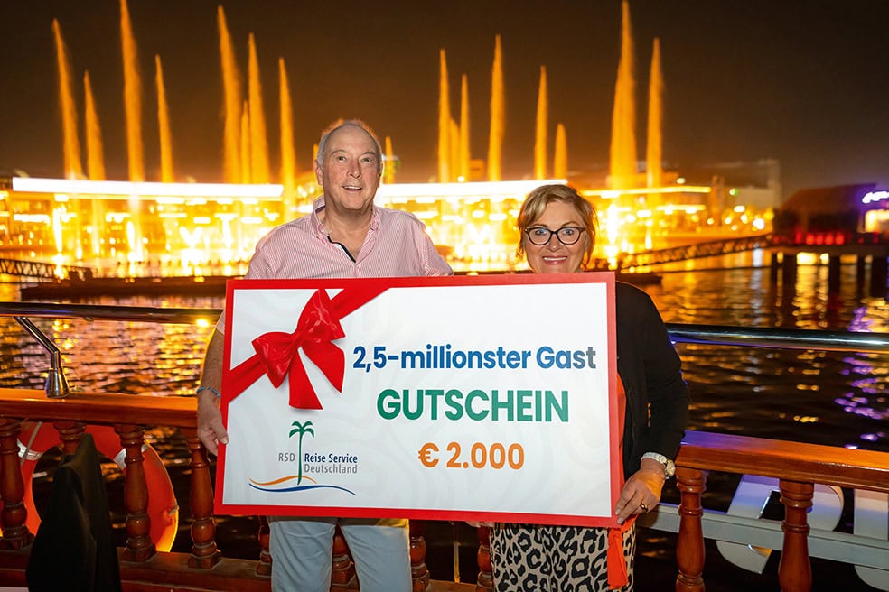 Sedan tog Mesut Güvenc till ordet i flygplansmikrofonet. RSD-representanten för semesterregionen rapporterade till gästerna: Under de cirka 16 år sedan grundandet har RSD otroligt nog kunnat visa 2,5 miljoner gäster de vackraste platserna runt om i världen. Och just idag och nu är dessa 2,5 miljonte gäster här ombord. Nämligen Reiner och Annemarie Lipps! Applåder bröt ut, gratulationer uttrycktes, och det skålades med champagne för jubilarerna. De var ganska häpna. „Så ofta har vi aldrig blivit fotograferade, vi var kvällens stjärnor“, minns de med ett leende. Och de fick verkligen anledning att glädjas. För som jubileumsgåva överlämnade vår RSD-representant ett resepresentkort på 2000 euro till dem.